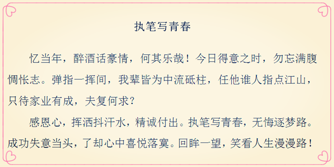 “現(xiàn)在,青春是用來奮斗的;將來,青春是用來回憶的。”當(dāng)所有的經(jīng)歷化作記憶,那些年少時為理想揮灑的汗水,為成功付出的艱辛,終將成為彌足珍貴的人生財富。