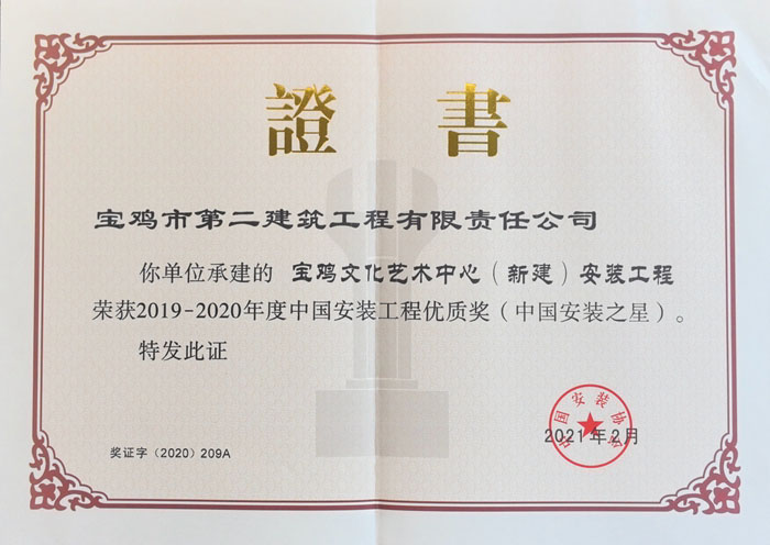 2019~2020年度中國安裝工程優(yōu)質(zhì)獎(jiǎng)(寶雞文化藝術(shù)中心(新建)安裝工程)